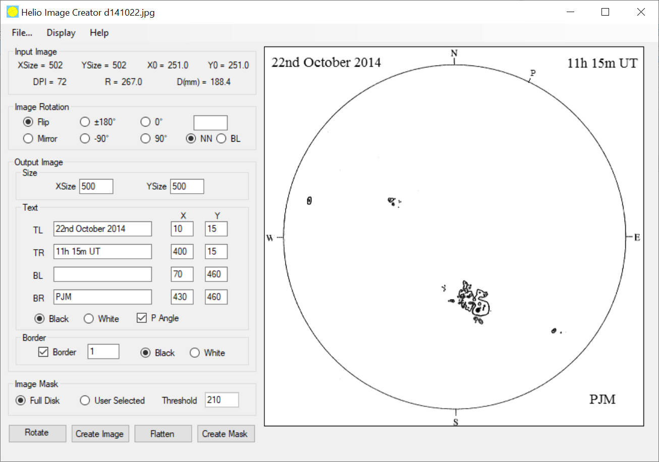 azimuth) and solar parameters (Bo, Lo, P, apparent diameter and