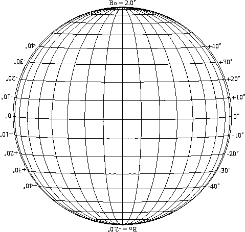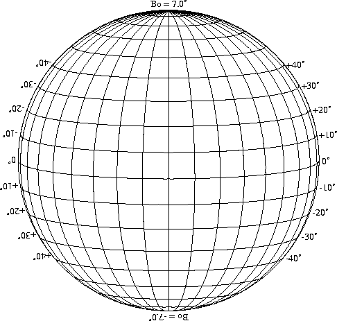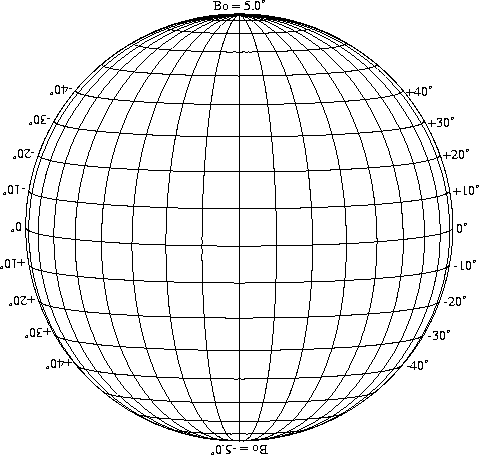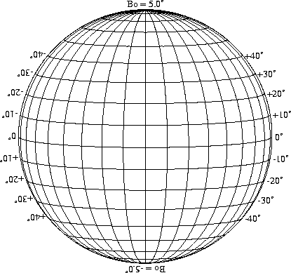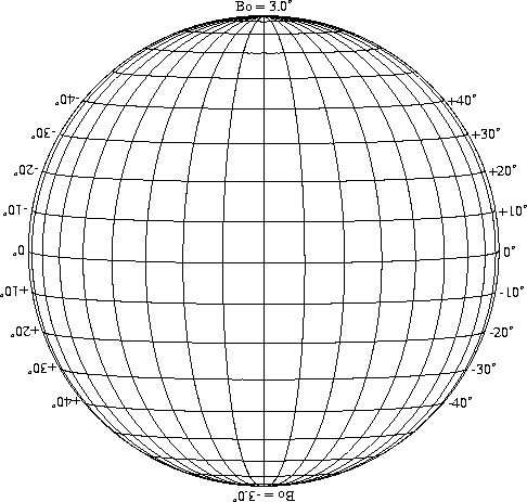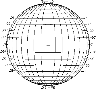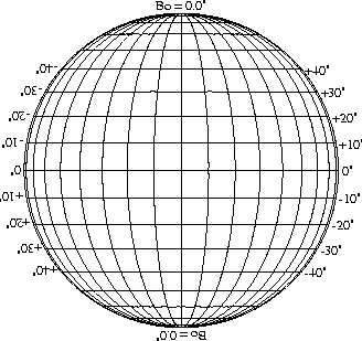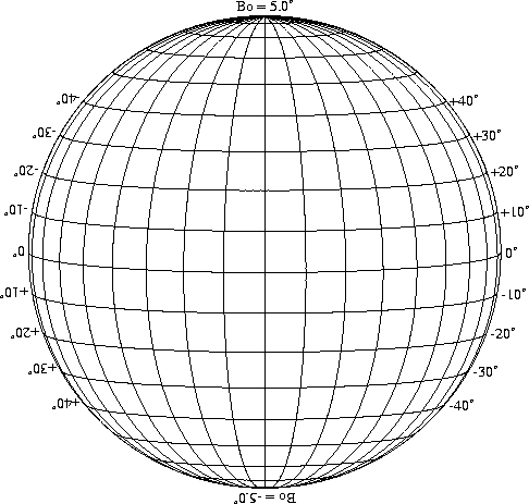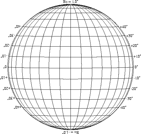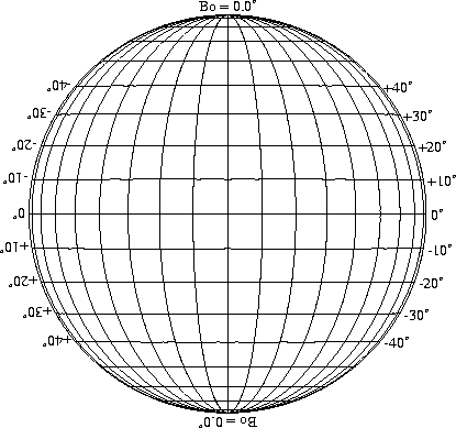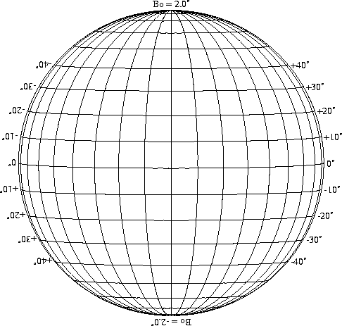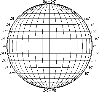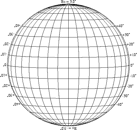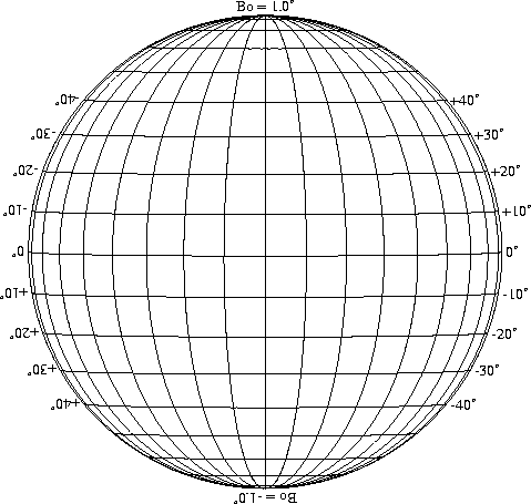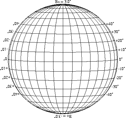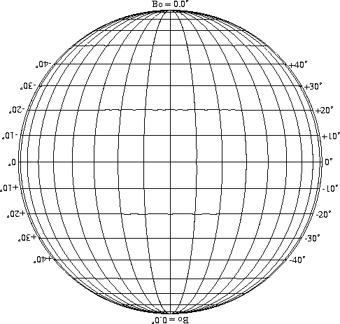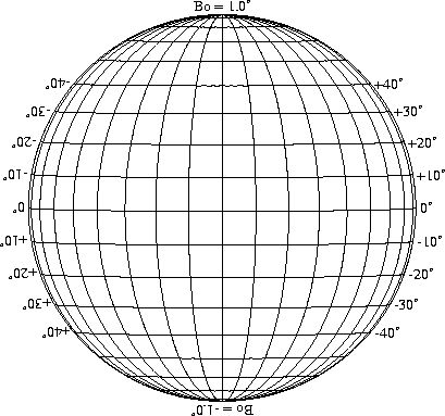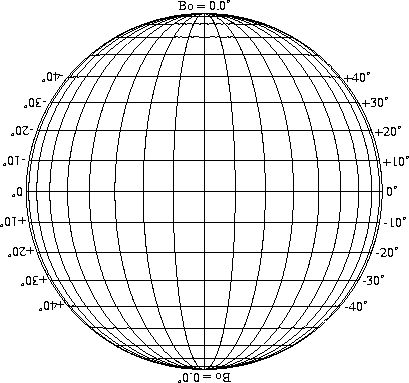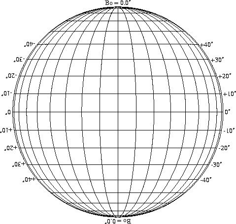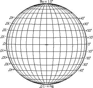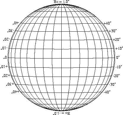 Stonyhurst Disks can be used to determine the latitude and longitude of sunspots (see the sunspot location page for further details). Use the tables below to obtain Stonyhurst disks for various Bo values and disk diameters.