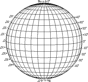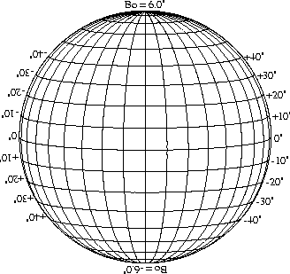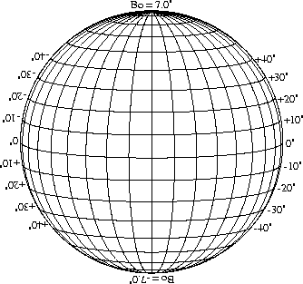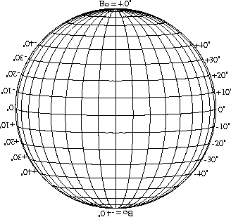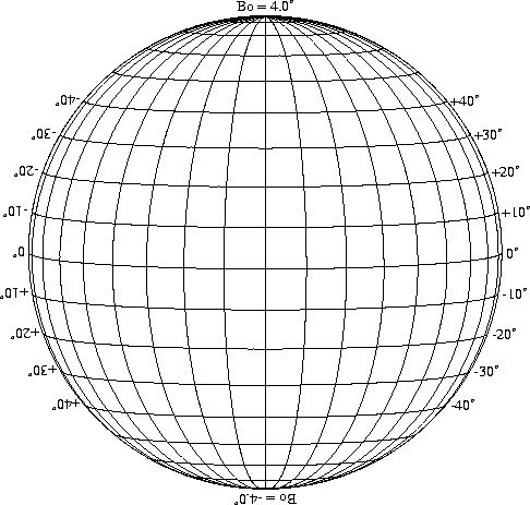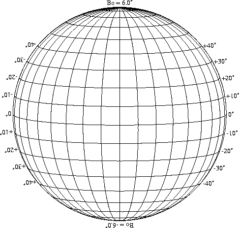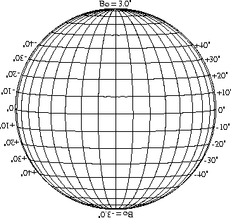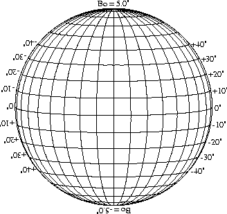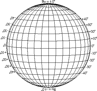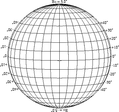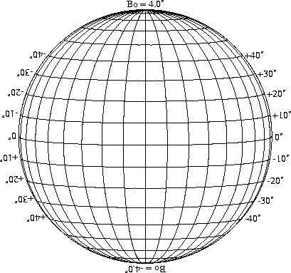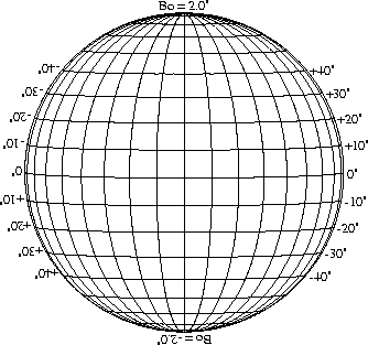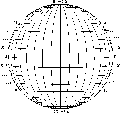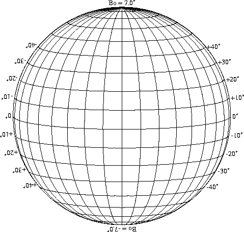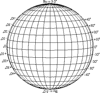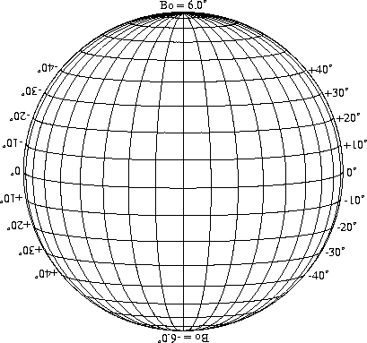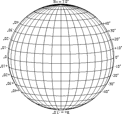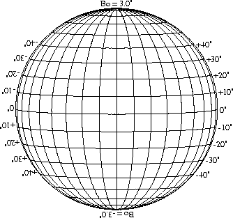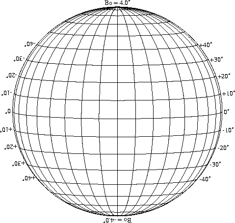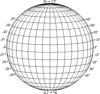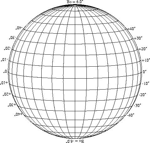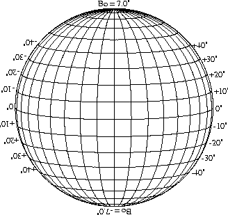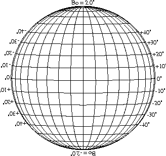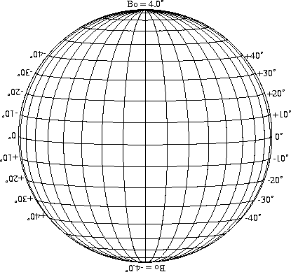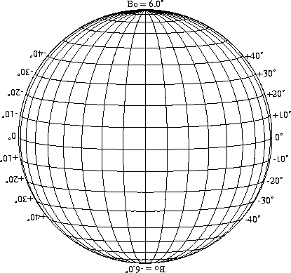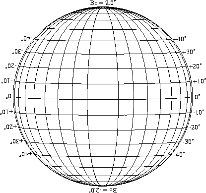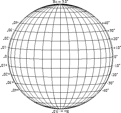 Stonyhurst Disks can be used to determine the latitude and longitude of sunspots (see the sunspot location page for further details). Use the tables below to obtain Stonyhurst disks for various Bo values and disk diameters.