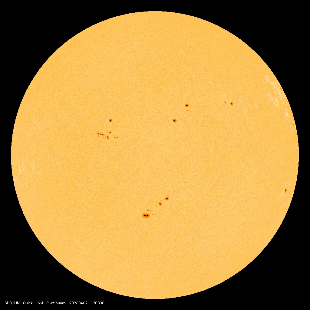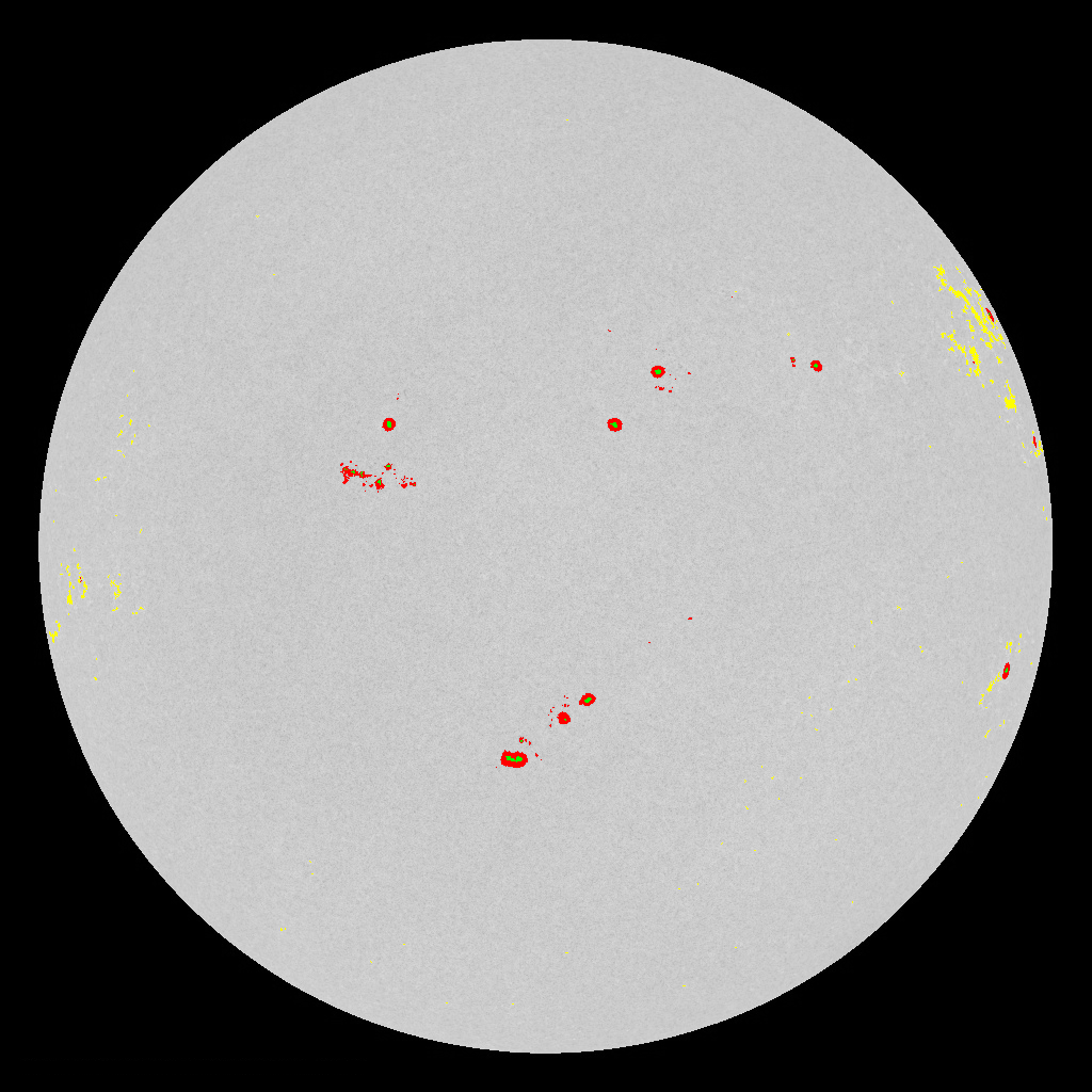 | Latest SDO HMI Image | Latest Mask (red penumbra, green umbra and yellow faculae) |